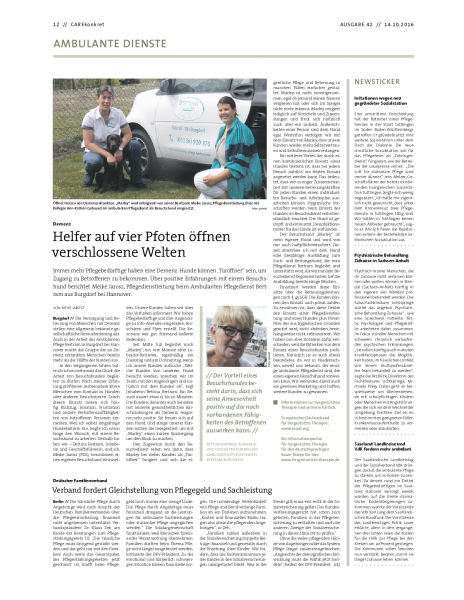 Der Ambulante Pflegedienst Bertram berichtet dort über positive Erfahrungen mit unseren Besuchshund „Marley“ speziell bei pflegebedürftigen Menschen mit Demenz.